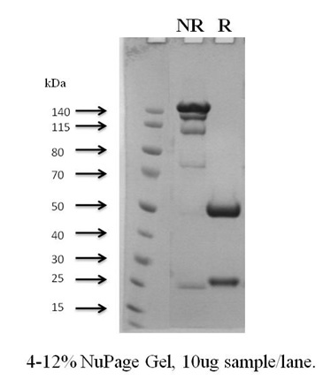A: Anti-huB7-H3 mAb (Cat.# A1009) on SDS-PAGE gel under non-reducing (NR) or reducing (R) condition.