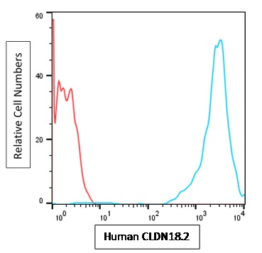 Detection of human CLDN18.2 expression on human CLDN18.2-CHO Stable cells using a mouse monoclonal antibody specific for human CLDN18.2 (in red) compared to a negative control (in blue).